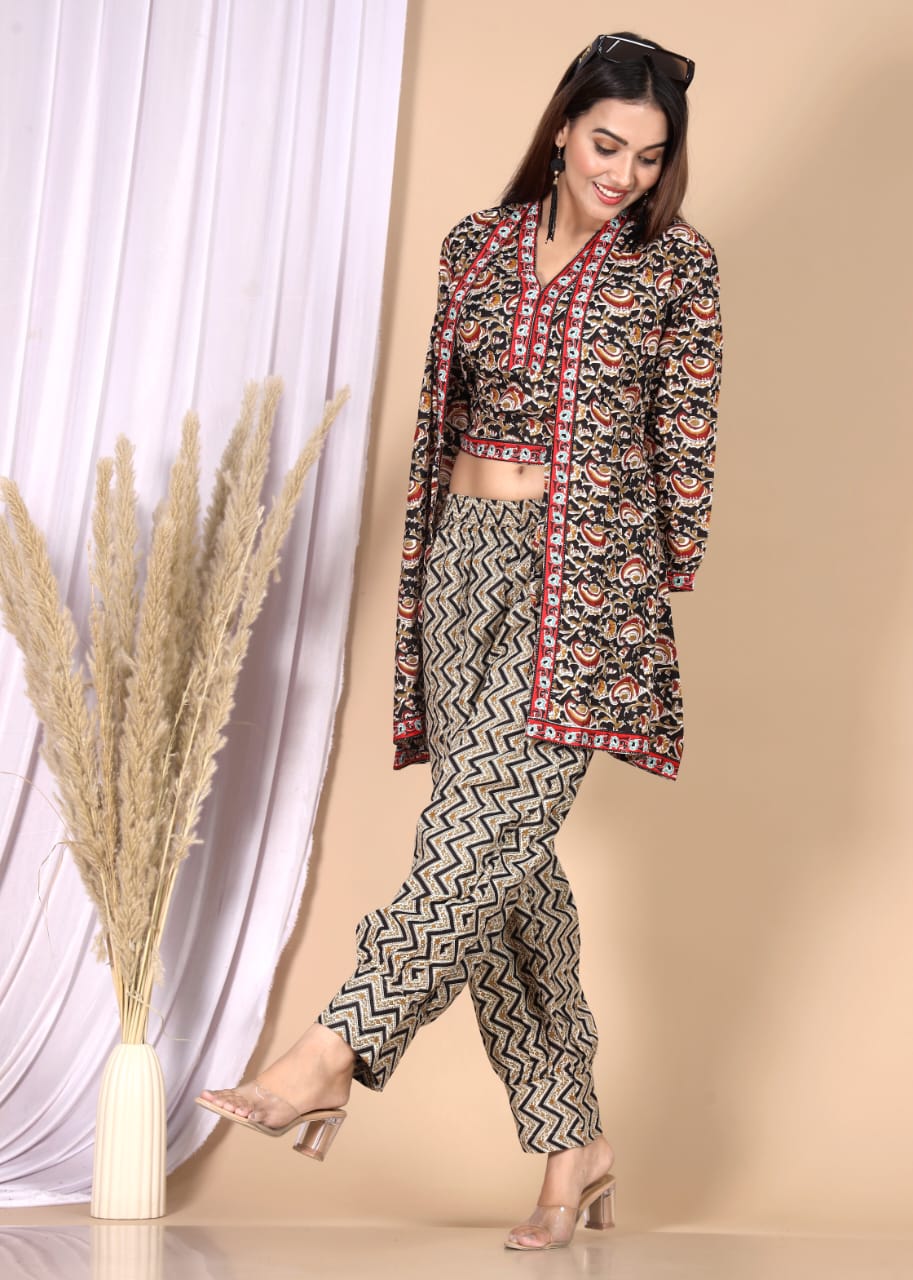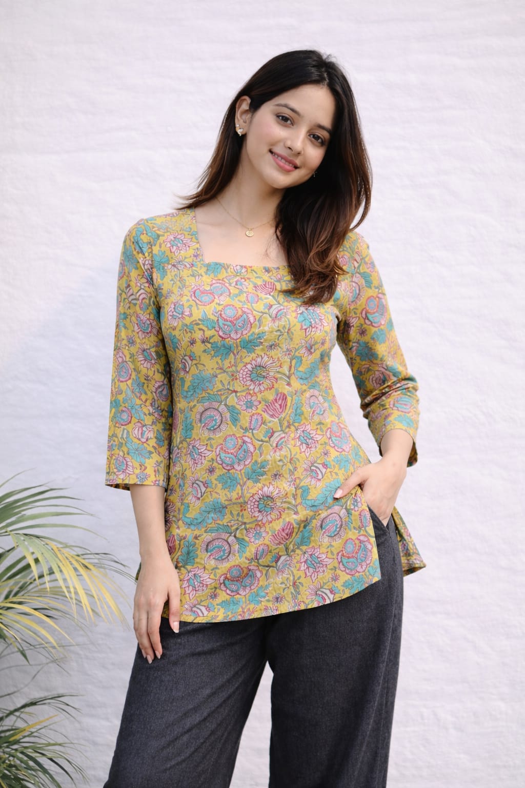 Women's Noir Black Floral Booti Block Print V-Neck 3/4 Sleeve Chic Short Kurti Top Smart Casual