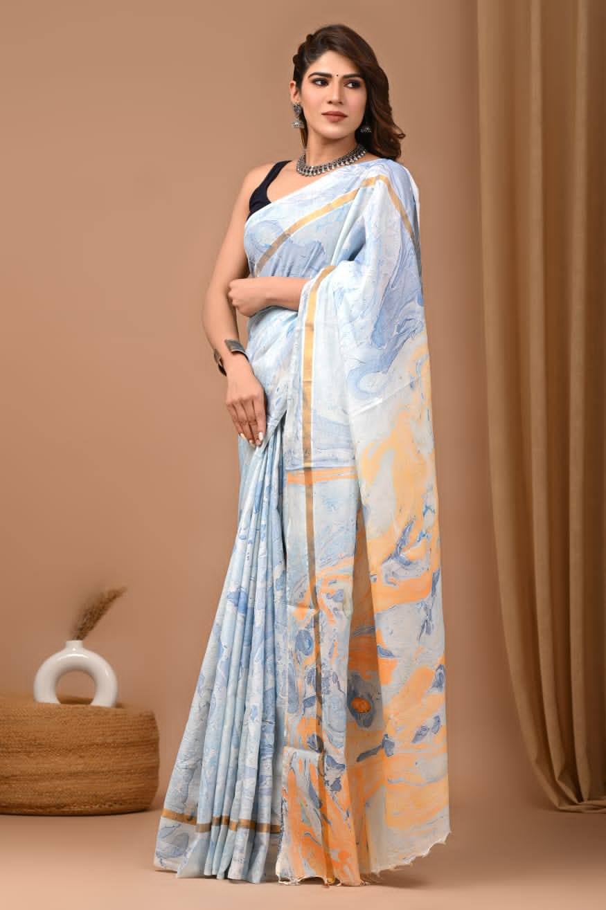 Off White Pure Mulmul Cotton Saree With Designer Printed Blouse Material