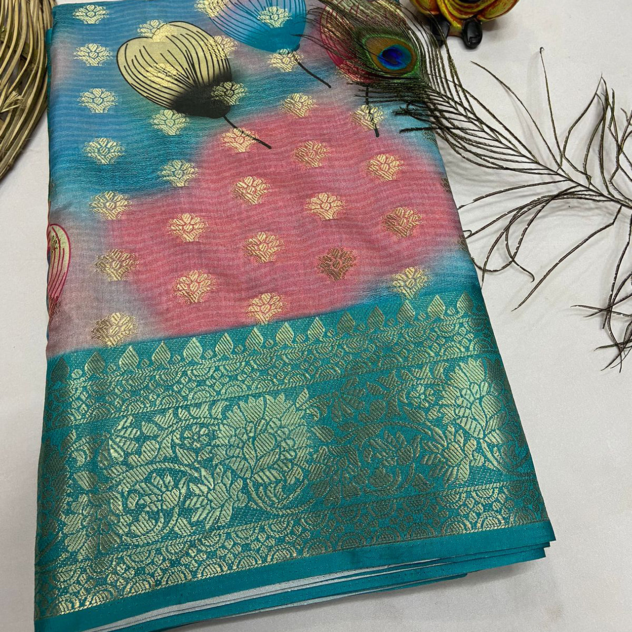 Rich Teal Banarasi Crepe Silk Digital Saree For Festive Wear