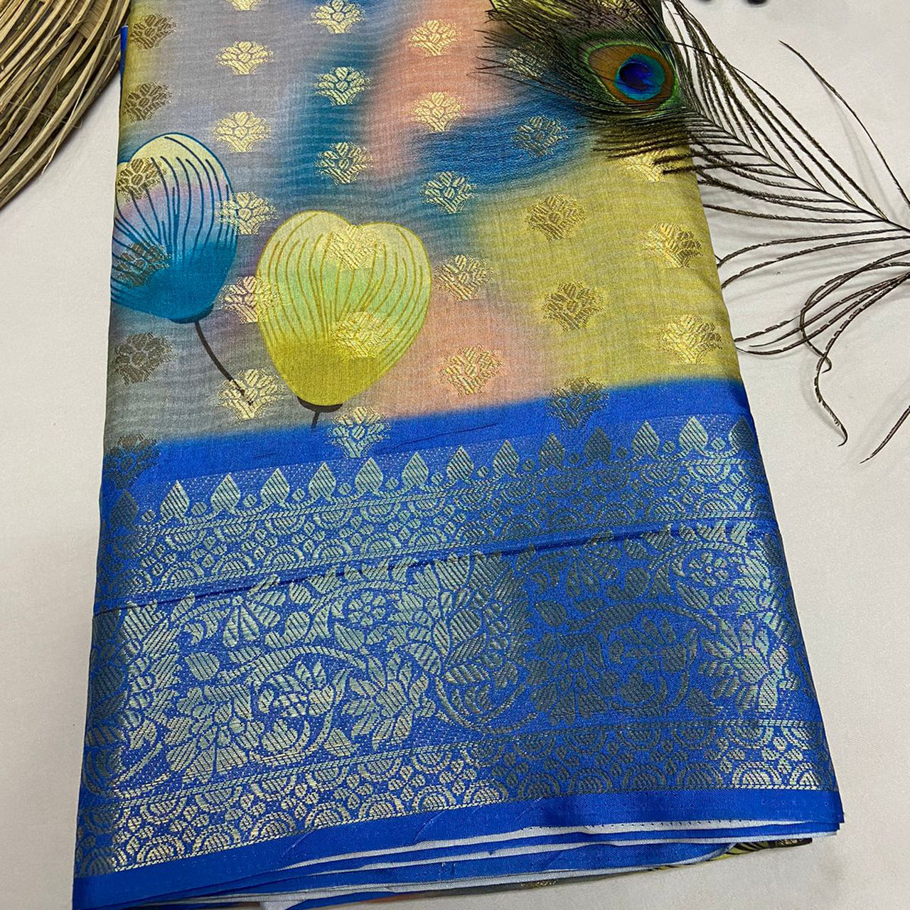 Soft Blue Crepe Georgette Silk Saree With Banarasi Print Highlights
