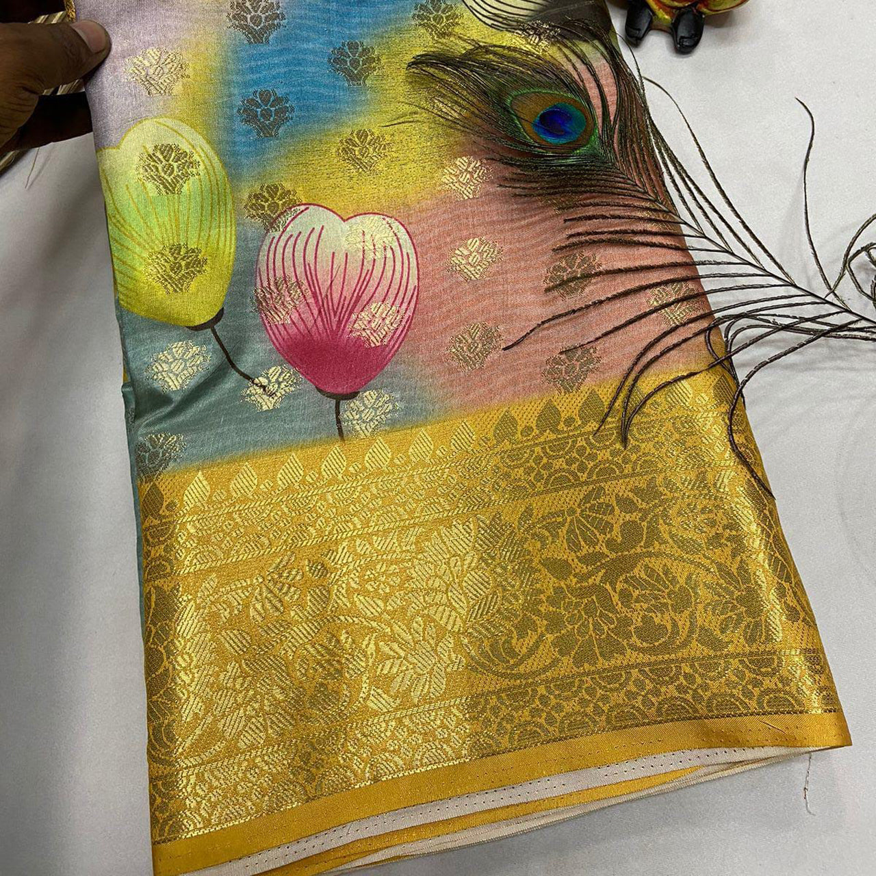 Traditional Turmeric Yellow Banarasi Silk Saree With Digital Printed Crepe Finish