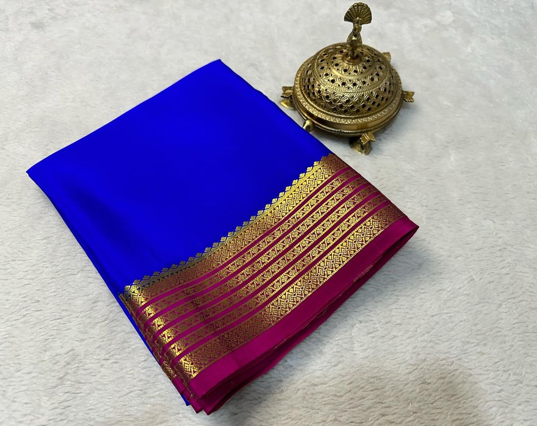 Graceful Plain Mysore Crepe Saree In Royal Blue With Heritage Zari Border Work