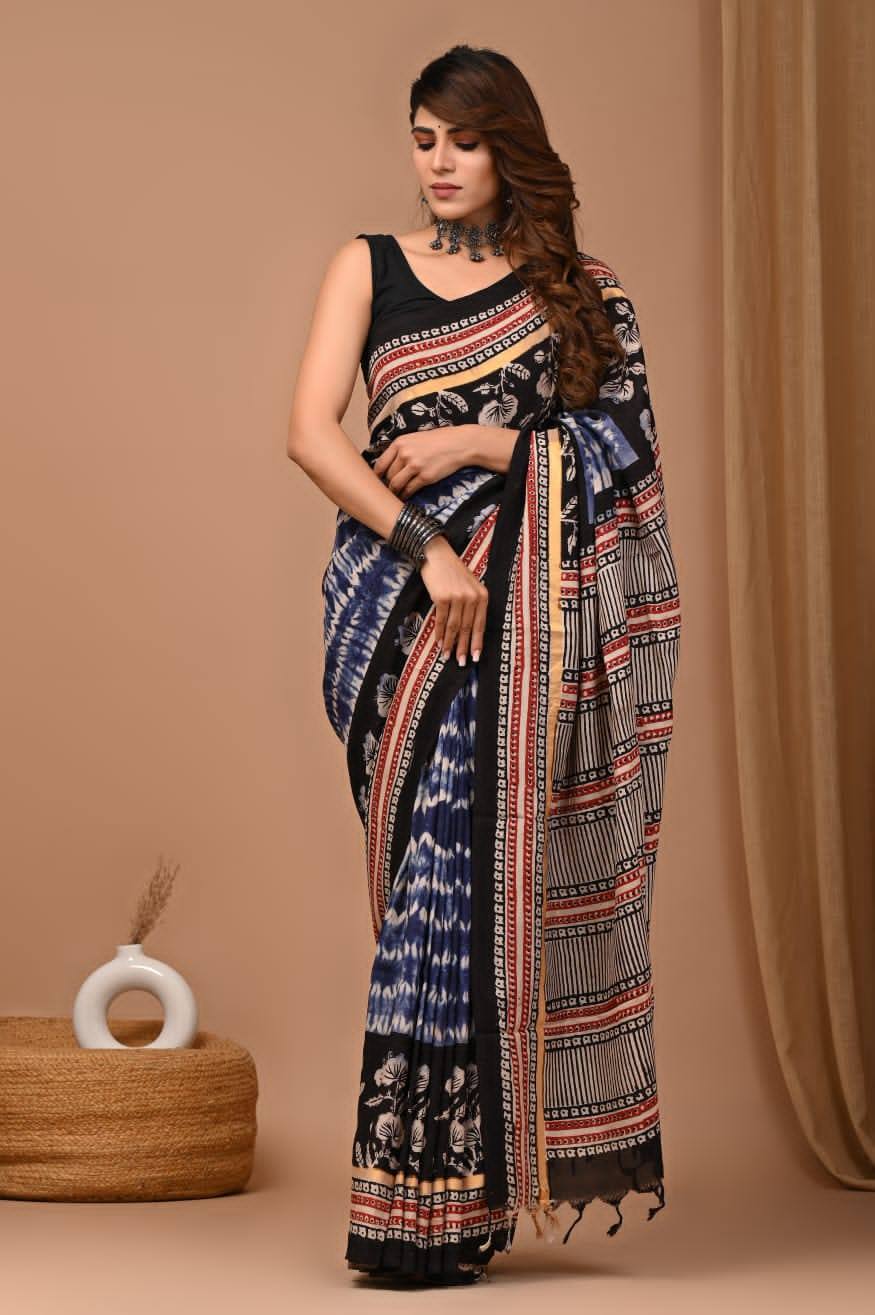 Discover the charm of tradition with our latest Cotton Mulmul Saree collection, crafted for those who adore timeless elegance. Featuring hand block prints that showcase Jahota and Ajrakh Vanaspati patterns, these sarees are a tribute to India's rich heritage of craftsmanship. Made from pure 92*80 premium cotton with super dying quality, these sarees are designed for exceptional comfort and style.