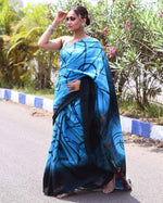 Cyan Pure Silk Saree With Intricate Handprint Design Traditional Look