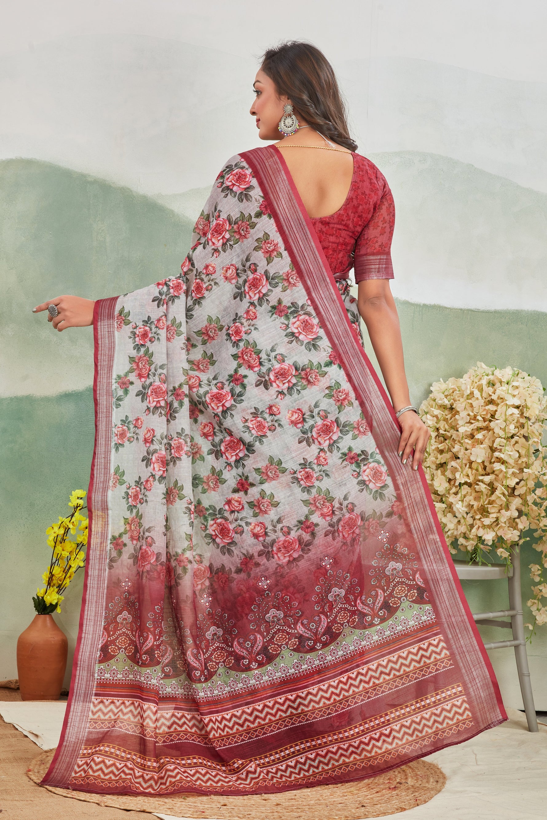 Chic Traditional Printed Saree In Pure Linen Breezy rED Everyday Fashion