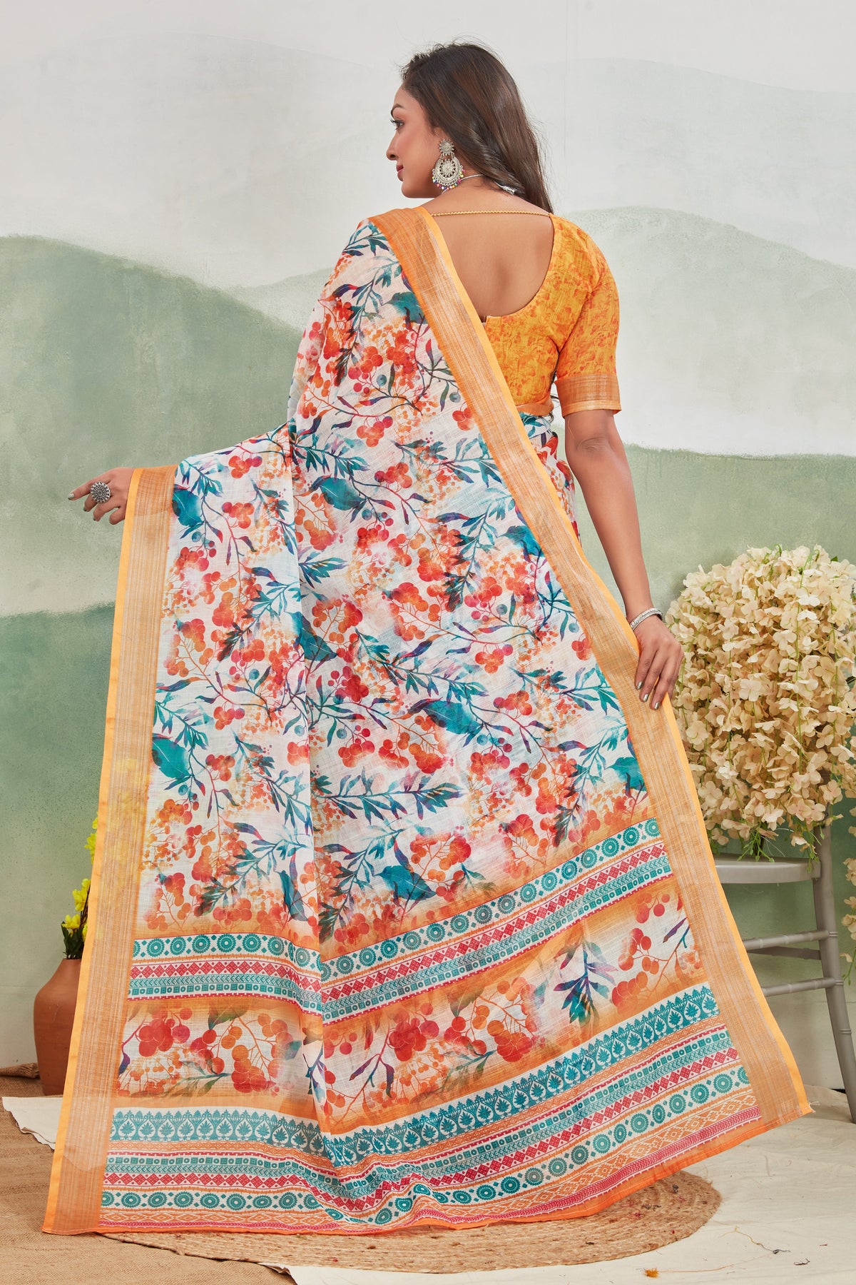 Elegant Orange Printed Linen Saree Pure Fabric For Daily Use