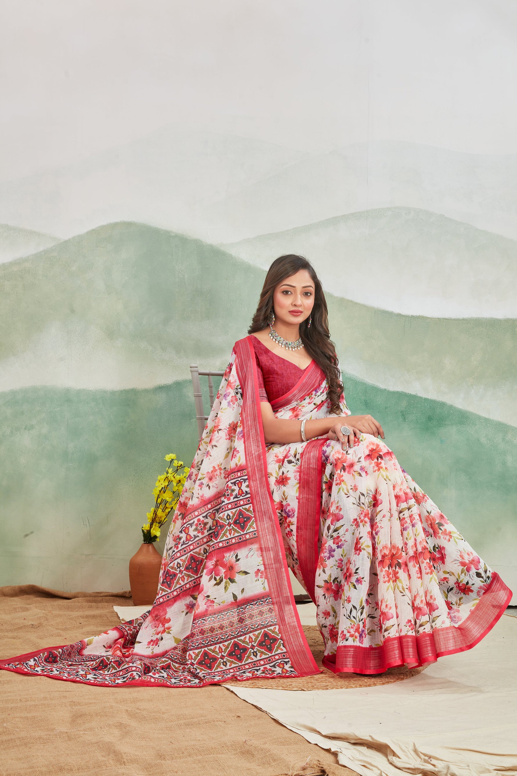 Red Summer Ready Linen Saree Pure Printed Casual Style