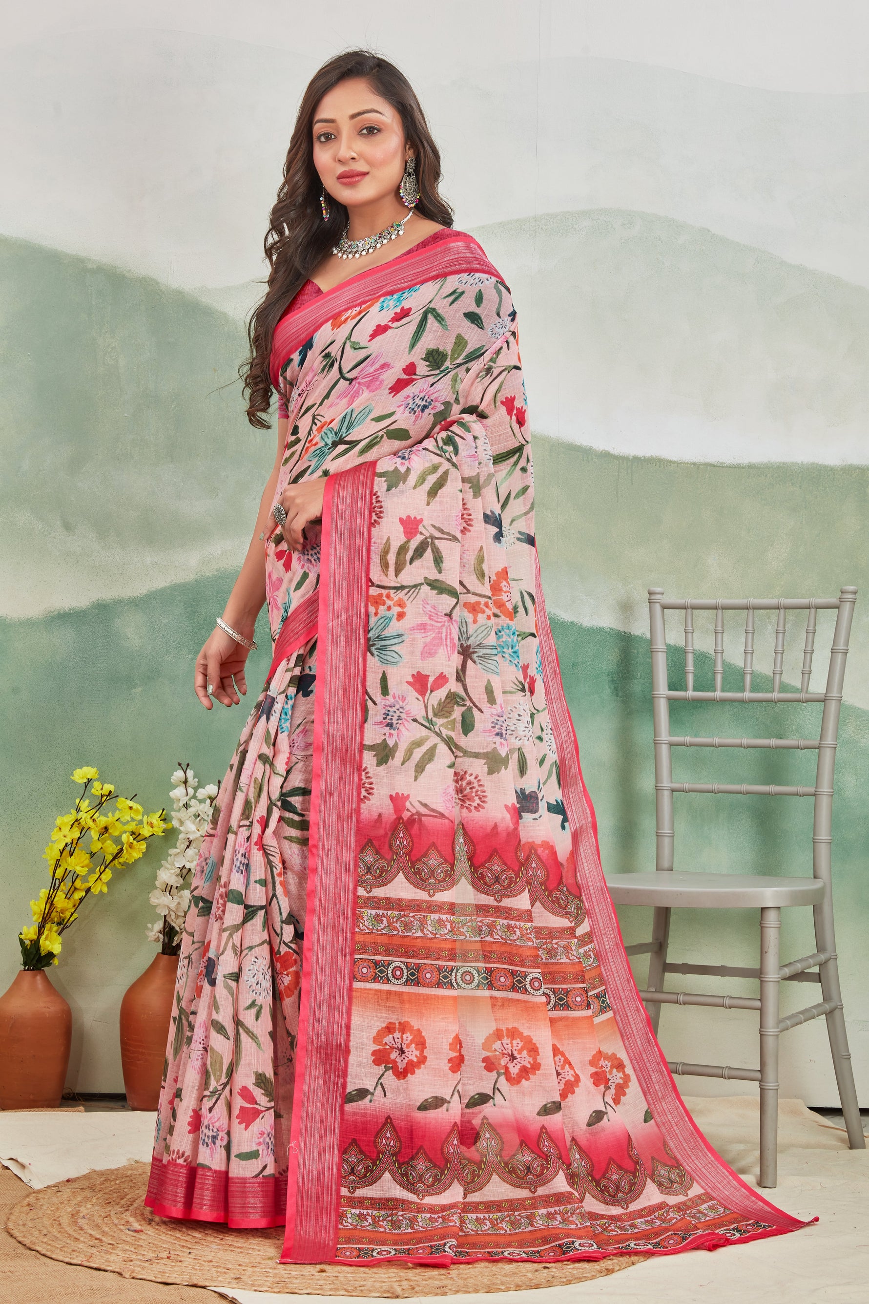 Trendy Daily Wear Saree Pink Pure Linen With Stylish Prints