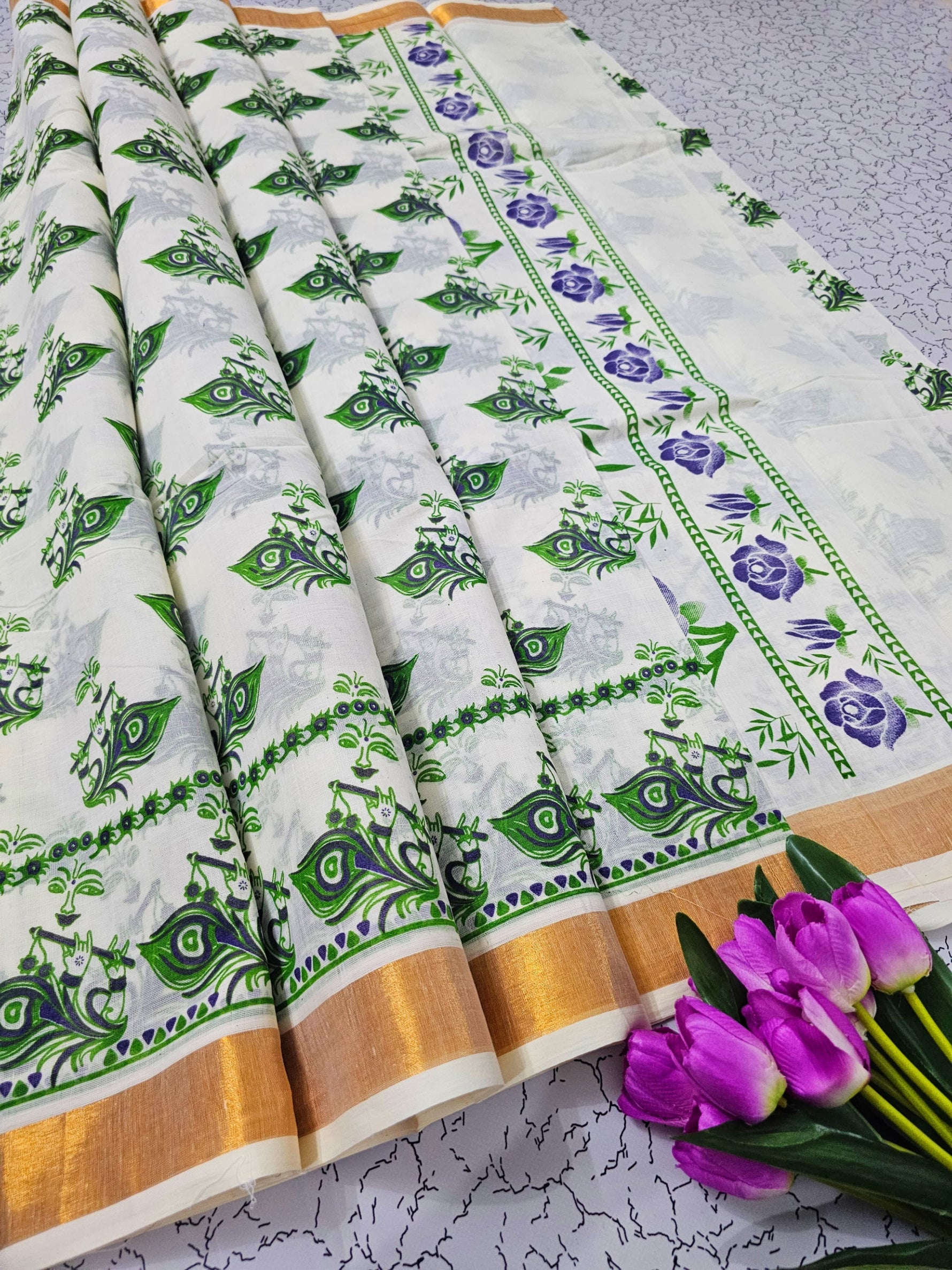 Classic Southloom Kerala Cotton Blend Saree With Printed Design And Blouse Material