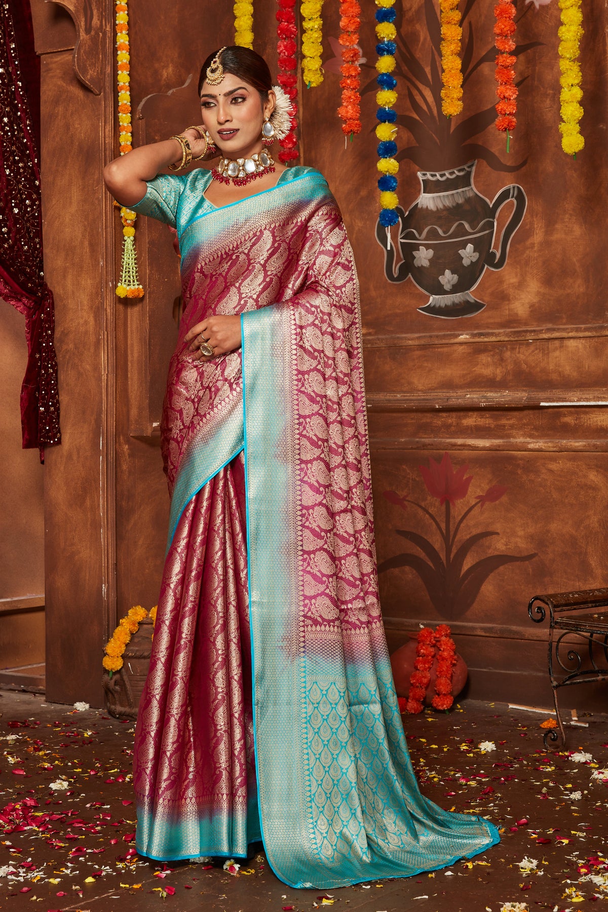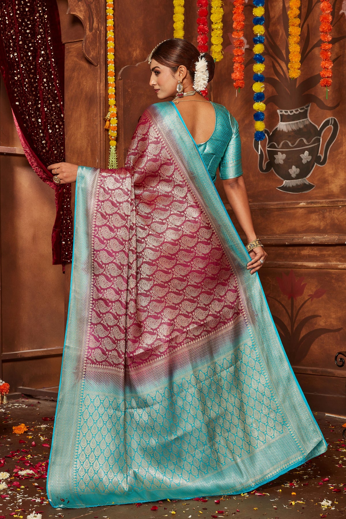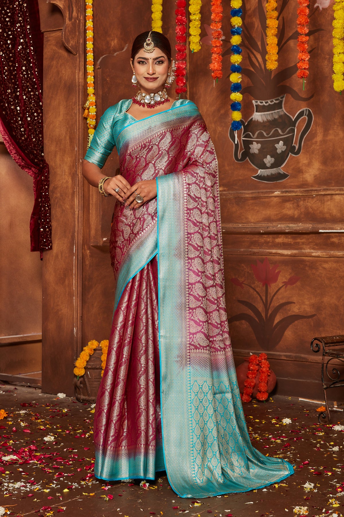 Enhance your festive look with this exquisite Mysore brocade silk saree. Featuring traditional Banarasi work, this stunning attire is perfect for wedding functions or celebratory gatherings. With a luxurious saree length of 5.5 meters and an unstitched blouse piece of 0.80 meters, it offers flexibility to style your outfit your way. Its intricate detailing and rich texture reflect timeless elegance. Ideal for those who value cultural authenticity and sophistication. For lasting vibrance, dry cleaning is recommended. Slight variations in color may occur, adding to its uniqueness.