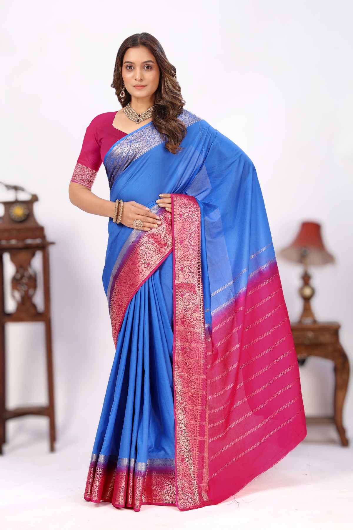 Classic Blue Zari Border Mysore Silk Saree With Fancy Blouse Fabric