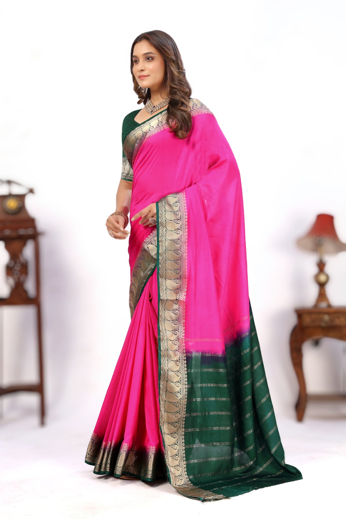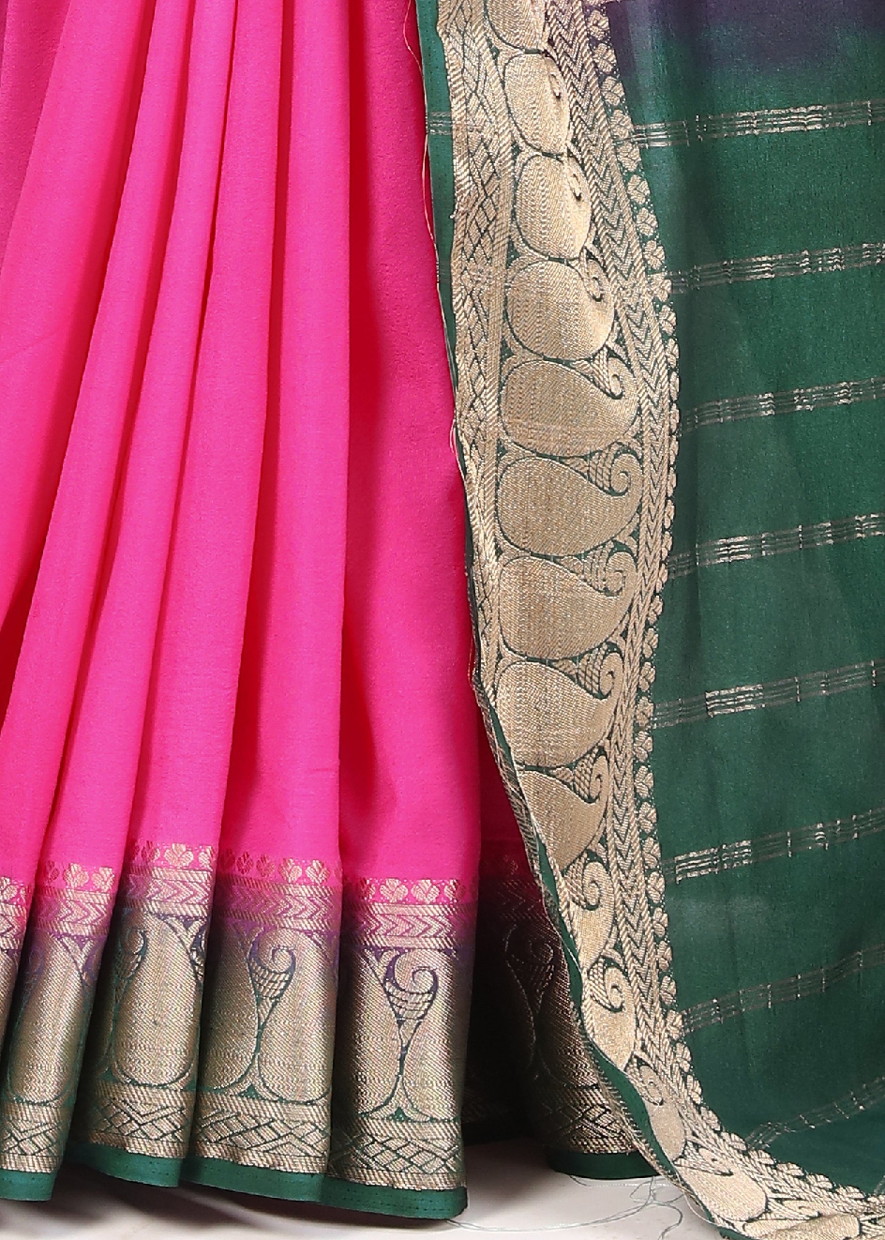 Bold Pink Mysore Soft Silk Saree With Shiny Zari Border And Blouse Combo