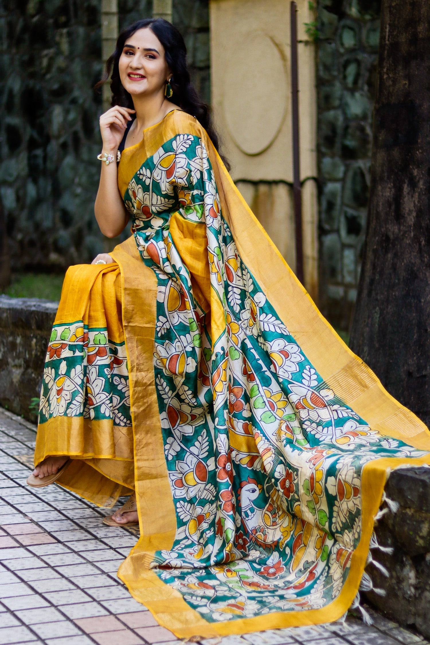 Partywear Tussar Silk Saree with Traditional Kalamkari and Trendy Blouse
