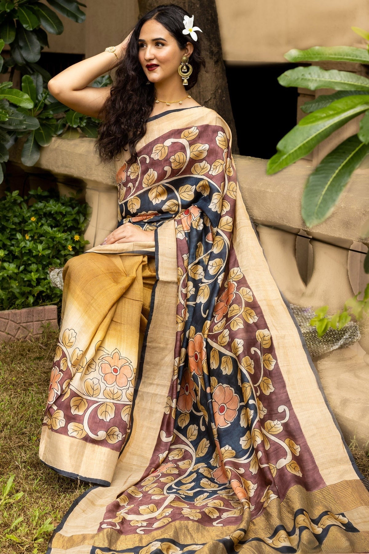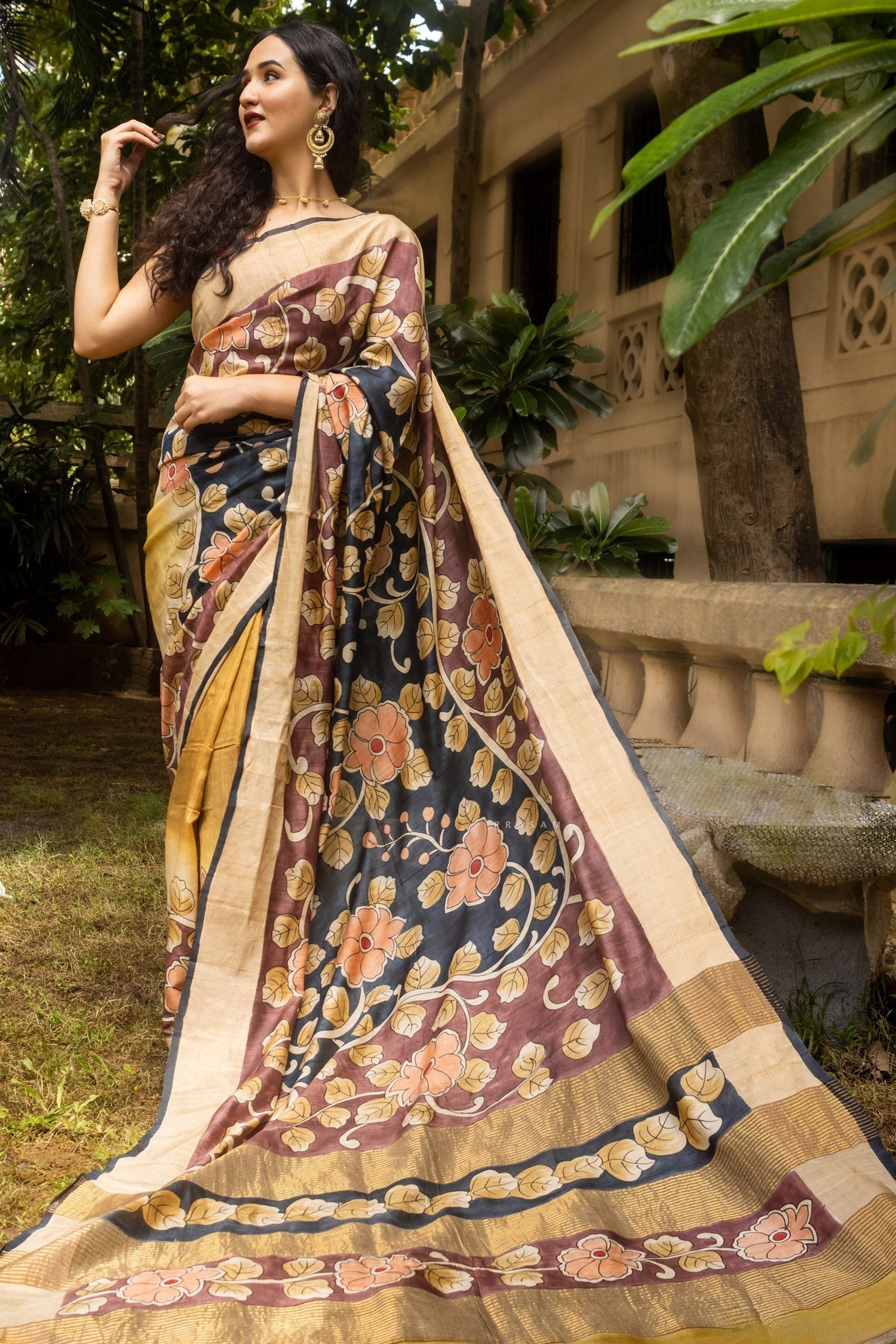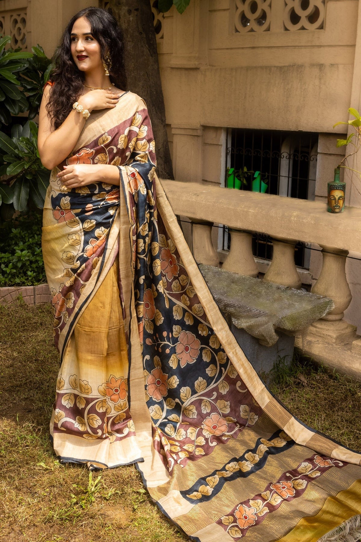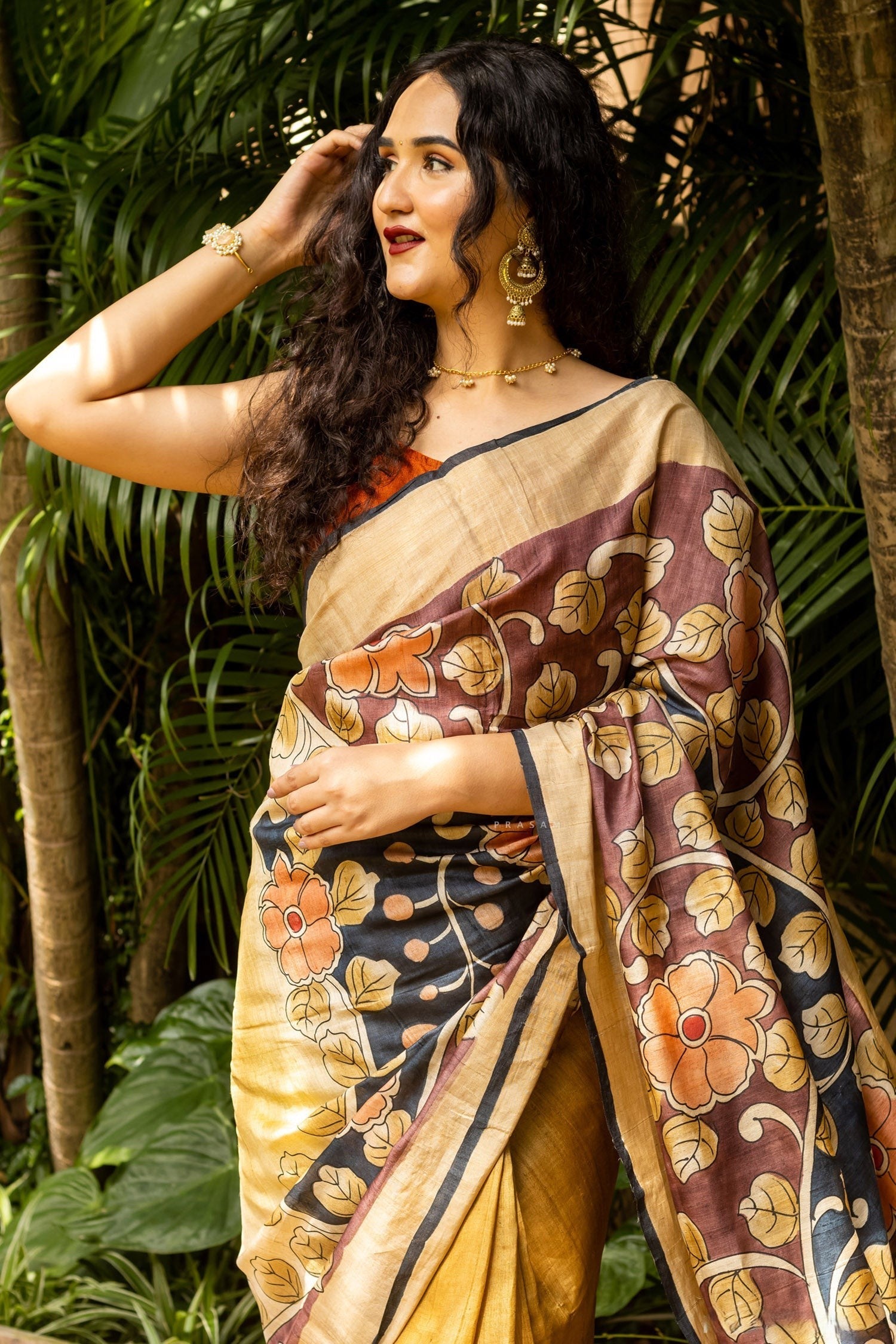 Traditional Art Tussar Silk Saree Kalamkari Print And Modern Blouse Twist