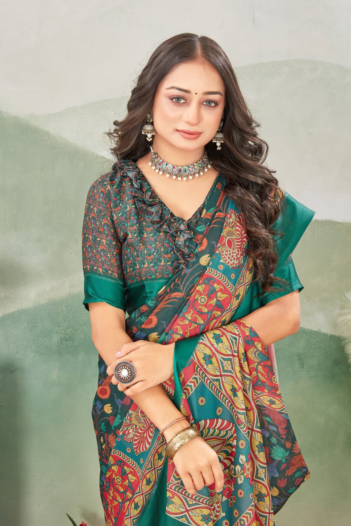 Traditional Yet Modern Parrot Green Viscose Satin Printed Saree For Parties And Ceremonies
