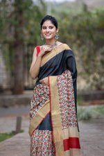 Experience the charm of traditional artistry with this exquisite Handloom Tussar Silk Kalamkari Print Saree. Designed for elegance, this saree is perfect for functions and festive occasions. The 5.5-meter length allows graceful draping, while the included 0.80-meter blouse piece complements its vibrant appeal. Its lightweight feel and intricate detailing make it a statement choice for women who adore cultural sophistication. Ensure the beauty of this fabric lasts by opting for dry cleaning only. A timeless addition to your ethnic wardrobe. Slight variations in color may enhance its uniqueness.