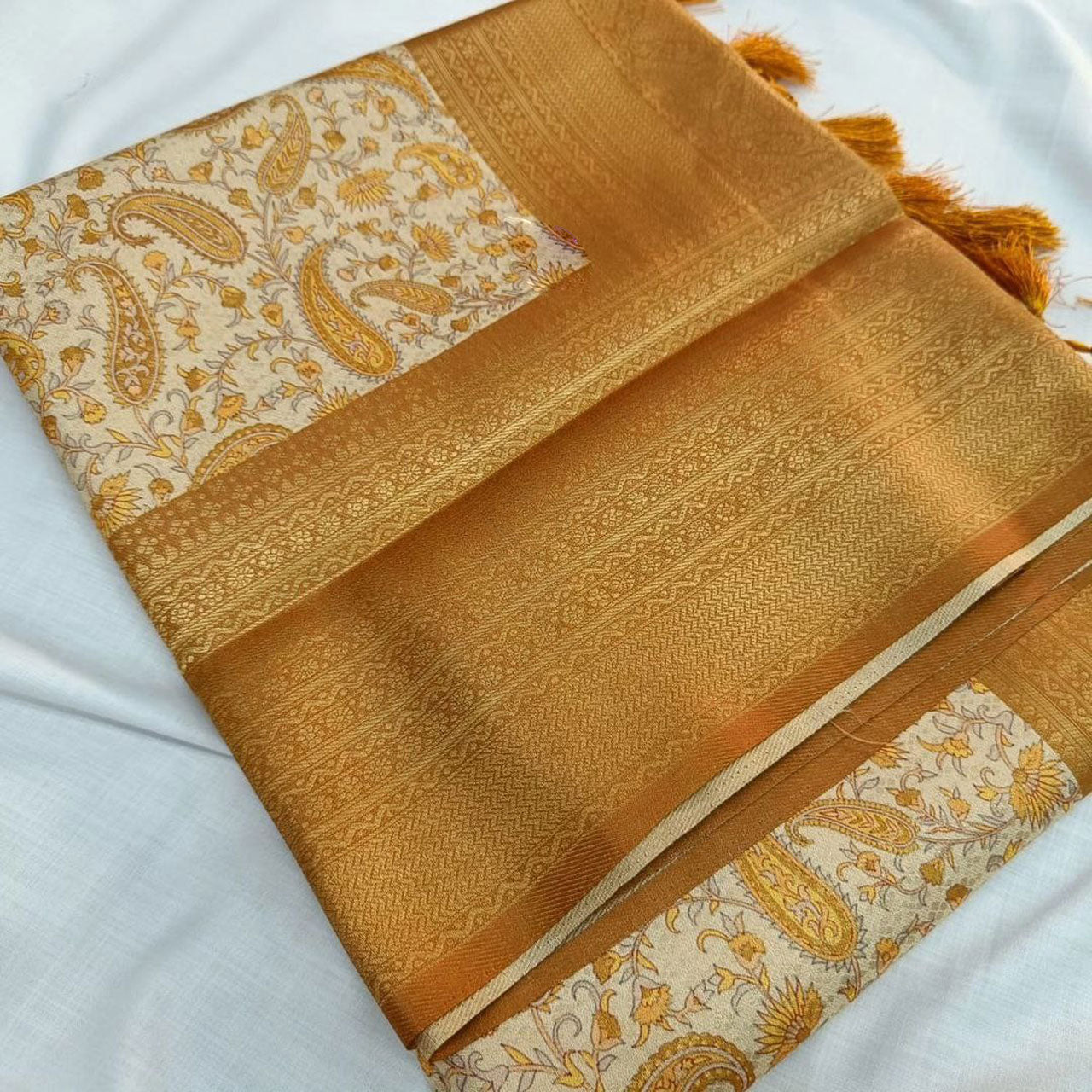 All Day Comfort Golden Soft Silk Saree Digital Print Casual Appeal