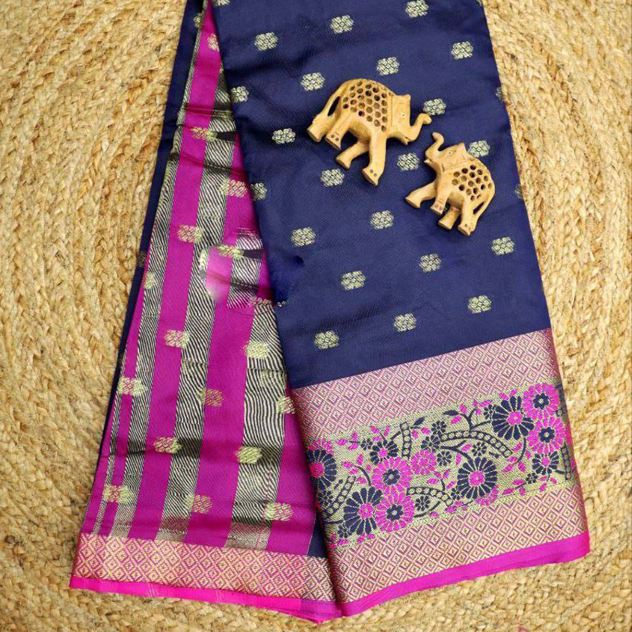 Navy Blue Weaving Work Silk Saree Korvai Style Perfect For Sangeet And Reception