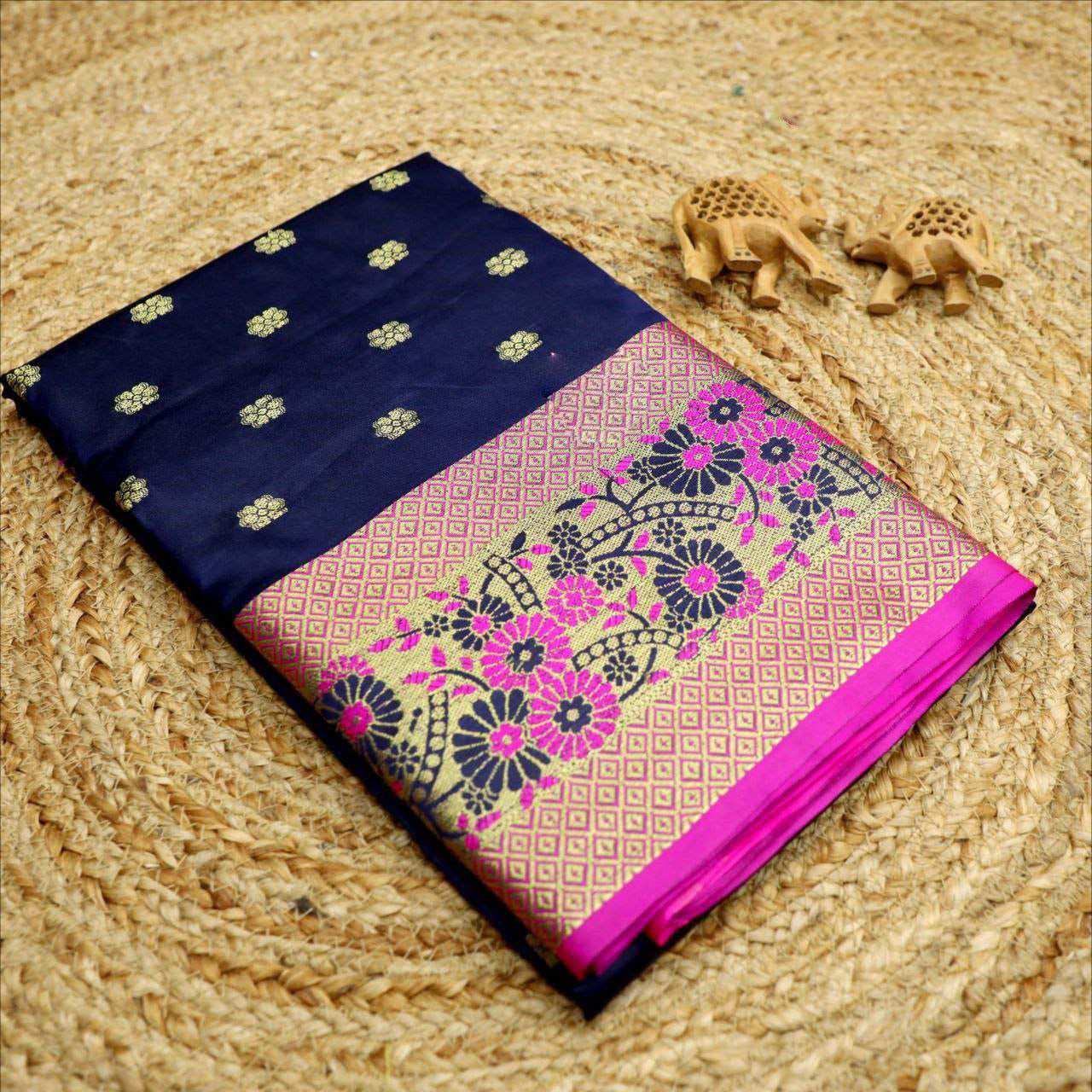 Bestselling Navy Blue And Pink Traditional Saree In Mysore Silk With Zari And Blouse